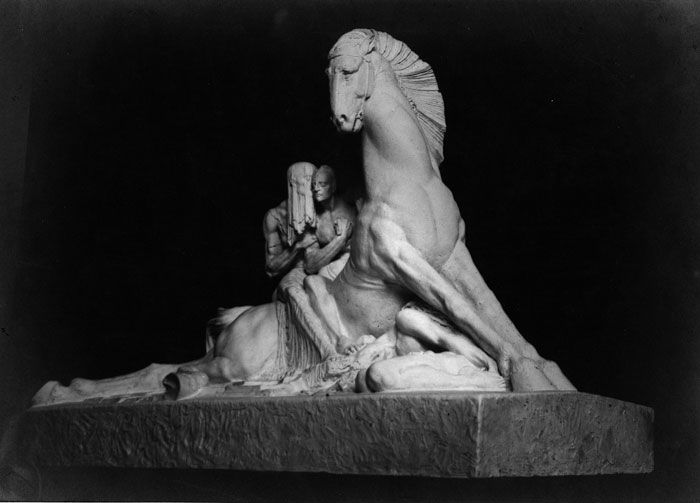 Þannig lýsir Einar efni verksins Skuld sem hann gerði fyrst drög að árið 1900, en fullvann ekki við fyrr en eftir að hann hafði sest að á Íslandi. Af orðum hans er ljóst að inntak verksins er af siðferðilegum toga, um ábyrgð mannsins á gjörðum sínum. Til að færa hugmyndir sínar um það efni í mynd hefur Einar leitað í norræna goðafræði um skapanornirnar Urði, Verðandi og Skuld. Má sjá þá leit hans í norrænan menningararf til forna í ljósi þjóðernislegrar vakningar víða í norðanverðri Evrópu undir lok 19. aldar sem meðal annars birtist í verkefnavali listamanna. Verkið Skuld sýnir fallinn hest sem spyrnir við fótum en við fætur hans liggur fallinn maður. Á baki hestsins situr knapinn sem hefur orðið valdur að dauða hins. Við hlið knapans er stórvaxin vera með hulu fyrir andliti og hvíslar í eyra hans. Ber að túlka hana sem örlaganornina sem minnir manninn á þá skuld sem honum ber að greiða fyrir gjörðir sínar. Formrænt séð er verkið byggt á andstæðum skálínum sem draga fram merkingu þess þar sem andstæður takst á: annars vegar viljinn til að halda áfam reið sinni og svífast einskis og hins vegar áminningin um að axla ábyrgð gjörða sinna.